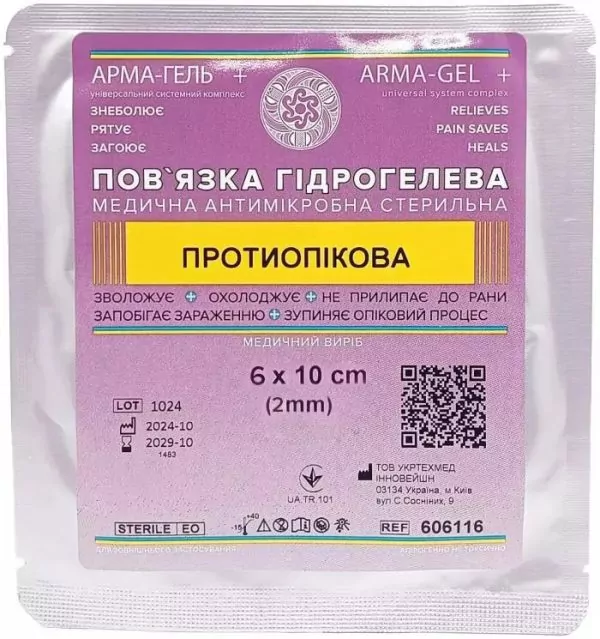 ПОВ`ЯЗКИ ГІДРОГЕЛЕВІ СТЕРИЛЬНІ МЕДИЧНІ «АРМА-ГЕЛЬ+» ПРОТИОПІКОВІ є засобом першої допомоги при опіках. Не вимагають спеціальної підготовки для того, щоб надати швидку і ефективну першу допомогу при будь-якому типі опікової травми. При накладанні пов’язки охолоджується місце опіку, зменшується вірогідність виникнення опікових пухирів. Пов’язка захищає рану від інфікування та зменшує ризик появи гіпертрофічних рубців при загоюванні. При досить сильних опіках може виконувати функції «другої шкіри». Після надання першої медичної допомоги необхідно звернутися до лікаря для системного лікування опіків.