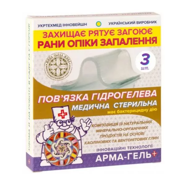 ПОВ`ЯЗКИ ГІДРОГЕЛЕВІ СТЕРИЛЬНІ МЕДИЧНІ «АРМА-ГЕЛЬ+» ПРОТИОПІКОВІ є засобом першої допомоги при опіках. Не вимагають спеціальної підготовки для того, щоб надати швидку і ефективну першу допомогу при будь-якому типі опікової травми. При накладанні пов’язки охолоджується місце опіку, зменшується вірогідність виникнення опікових пухирів. Пов’язка захищає рану від інфікування та зменшує ризик появи гіпертрофічних рубців при загоюванні. При досить сильних опіках може виконувати функції «другої шкіри». Після надання першої медичної допомоги необхідно звернутися до лікаря для системного лікування опіків.