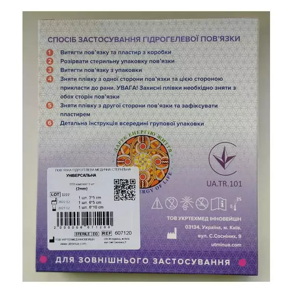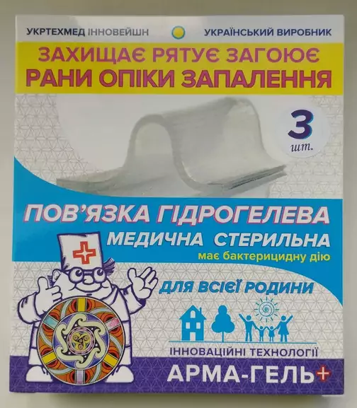 ПОВ’ЯЗКА ГІДРОГЕЛЕВА МЕДИЧНА СТЕРИЛЬНА «АРМА-ГЕЛЬ+» УНІВЕРСАЛЬНА – це стерильне ранове покриття, яке забезпечує закриття і механічний захист ран від забруднення, інфікування та іншого негативного зовнішнього впливу, має ранозагоювальний, знеболювальний, протизапальний і антисептичний ефекти.