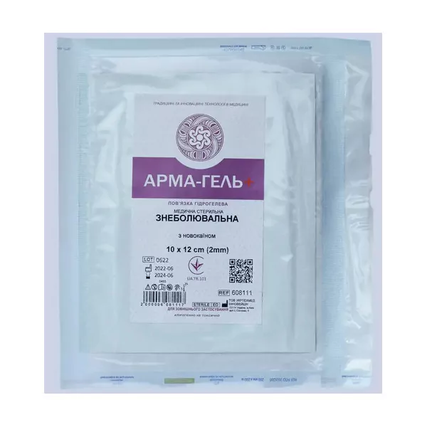 ПОВ`ЯЗКИ ГІДРОГЕЛЕВІ СТЕРИЛЬНІ МЕДИЧНІ «АРМА-ГЕЛЬ+» З НОВОКАЇНОМ призначаються лікарем з урахуванням необхідної методики лікування. Пов’язка поглинає ексудат, який виділяється з рани. За рахунок сітчастої матриці пов’язка здатна поглинати великий об’єм виділень не руйнуючись. Одночасно з цим лікарський засіб, який знаходиться в полімерній матриці пов’язки, повільно виділяється та проникає в рану, створюючи пролонгований лікувальний ефект. Завдяки дренажним та сорбційним властивостям пов’язки некротичні утворення розм’якшуються, що дозволяє досить легко їх видаляти з рани. Лікарський засіб НОВОКАЇН додає місцеву анестезуючу дію, знімає біль при складних ранах.